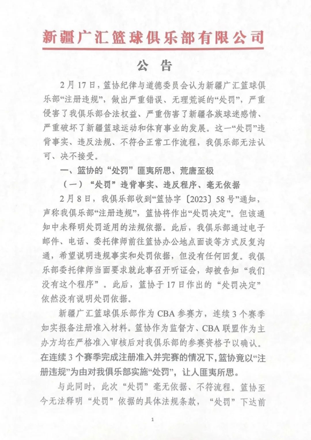 昨日深夜,新疆广汇男篮俱乐部一篇退出公告,不但怒批中国篮协对自己“注册违规”的处罚严重错误、无理荒诞,而且点名姚明,并以“三个为什么??”质疑CBA联盟的经纪人业务、主要赞助商业务为什么均由某家体育管理公司大量承揽,以及“还有比这些更为……”暗示篮协的更大黑幕。