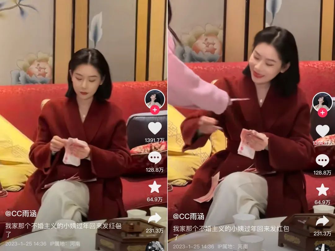 短短几秒的视频里,妆容精致、气质优雅的小姨,坐在沙发前不急不缓地数好压岁钱,再面带微笑地分给每一个小朋友,铺面而来的,是属于独立女性的自信和从容。