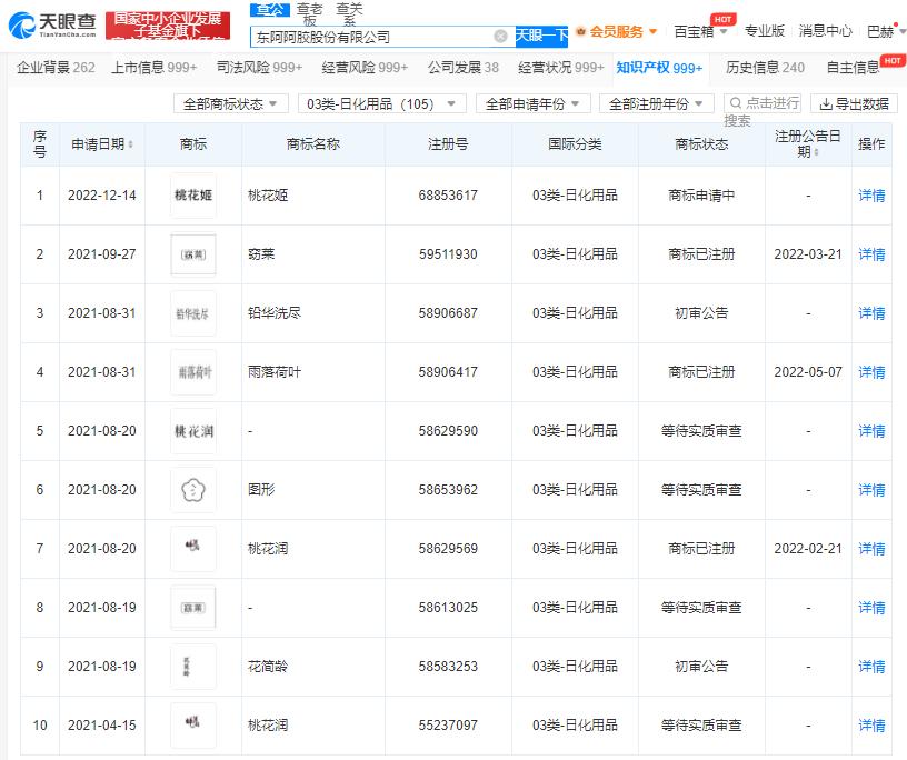 天眼查显示,东阿阿胶股份有限公司注册的日化用品类商标多达105个,包括“桃花润”、“桃花姬”、“润玉颜”、“胶城”、“真颜CHINELLE”、“黛娇颜”等多个商标。
