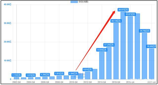 不断提价的同时,东阿阿胶的存货也在也不断增加,就在2018年达到净利润高峰的前一年,东阿阿胶的存货已经达到36亿元,相对较2010年增长了20倍左右。