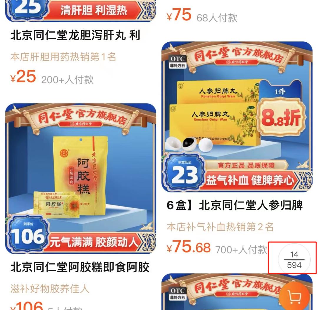 而反过来对比竞品“同仁堂”,“同仁堂官方旗舰店”品类更齐全,其产品矩阵更是多达594款。