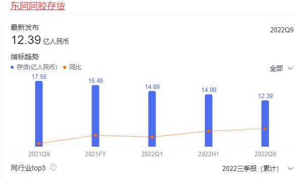 根据官方公告显示,截止2022年3月底,东阿阿胶存货为14.89亿元,相较年初16.46亿元,三个月内再削减1.57亿元,减少约1成,这是8年来的最低值。
