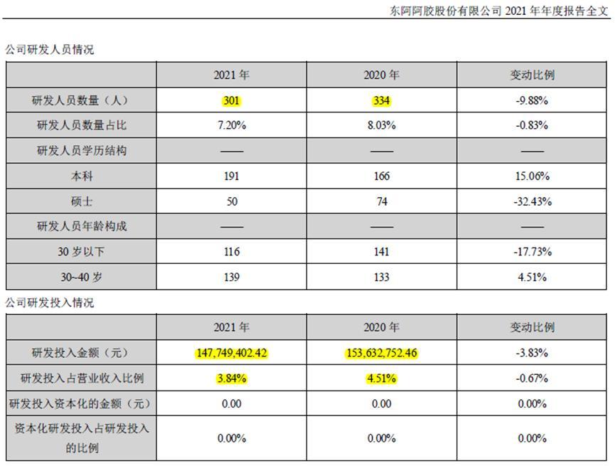 但研发人员的减少是客观存在的。根据东阿阿胶2021年年报显示,公司研发人员总数、硕士人员、30岁以下人员分别减少了9.88%、32.43%和17.73%。