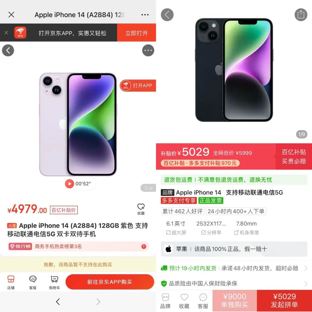 具体而言,我们可以看到,在百亿补贴频道里,京东的 iPhone 14 128GB 版本,定价为 4979 元。而拼多多相同版本的定价是 5029 元,便宜了 50 元。最直观的则是五粮液的定价,双瓶 52 度的 500 毫升的八代普五,定价为 1836 元,比市场价便宜了近 200 元。