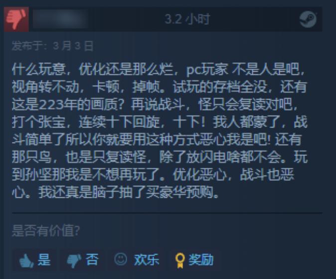 要么是键鼠操作不适配,要么就是单纯地卡顿闪退,话里话外透露着对 PC 玩家的不屑,明明大伙还用着最顶级的硬件,买着不能二手置换的数字版游戏。