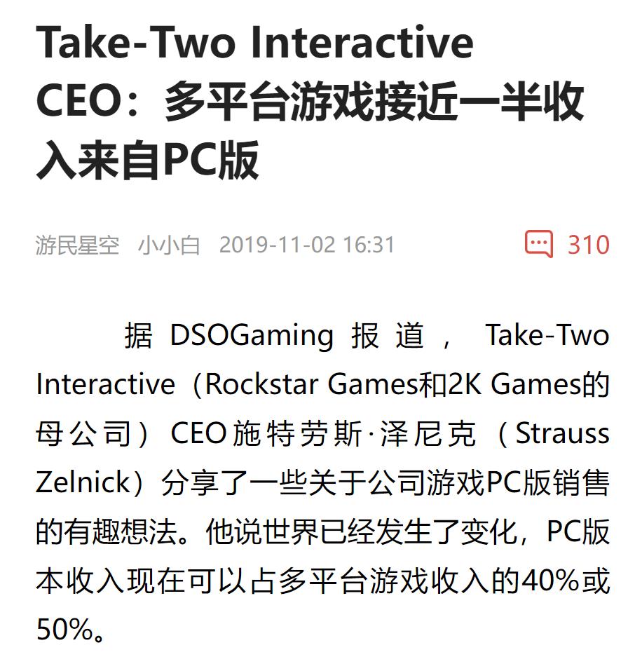 Take-Two Interactive CEO:多平台游戏接近一半收入来自PC版