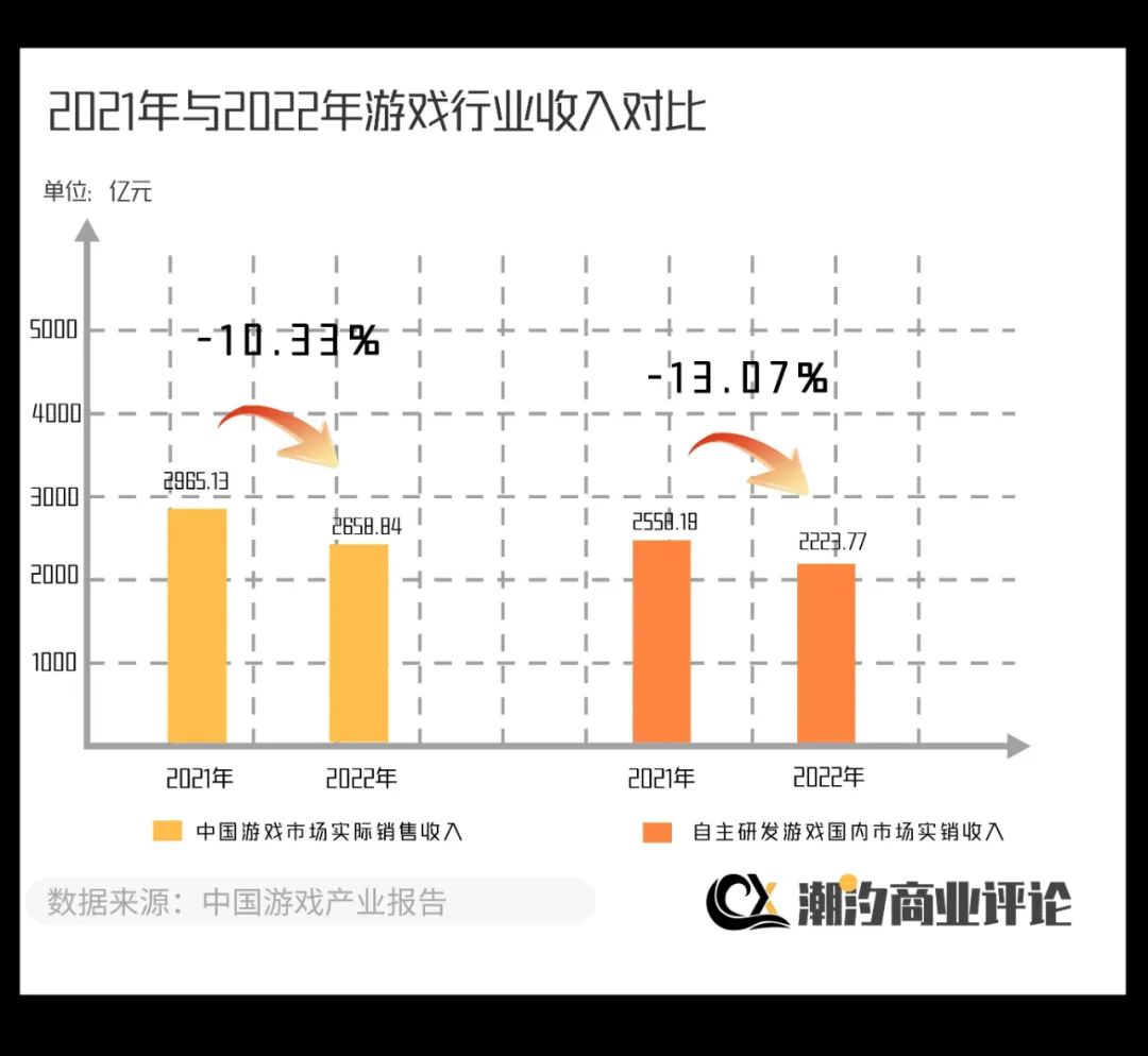 中国游戏产业报告显示,2022中国游戏市场实际销售收入为2658.84亿元,同比减少306.29亿元,下降10.33%。而自主研发游戏国内市场实销收入为2223.77亿元,同比下降了13.07%。