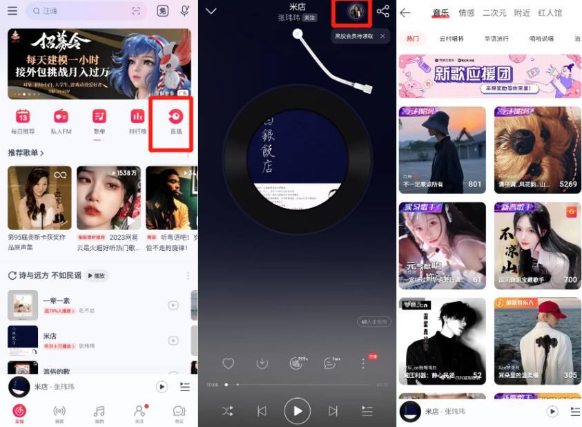 以网易云音乐为例,首页发现tab的黄金入口为直播开放,播客页面能找到直播推荐,歌曲播放页以及歌曲评论区里也在为直播导流。按照直播类型划分,目前网易云音乐平台的主播主要有音乐、情感、二次元等。