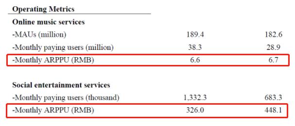 财报里占总营收比重接近六成的社交娱乐服务,其收入绝大部分都是来自直播相关的打赏等增值服务。进一步细看,2022年,网易云音乐每月社交娱乐服务ARPPU为326元,在线音乐服务ARPPU为6.6元,二者相差49倍。腾讯音乐财报里,两组数据相差20倍。