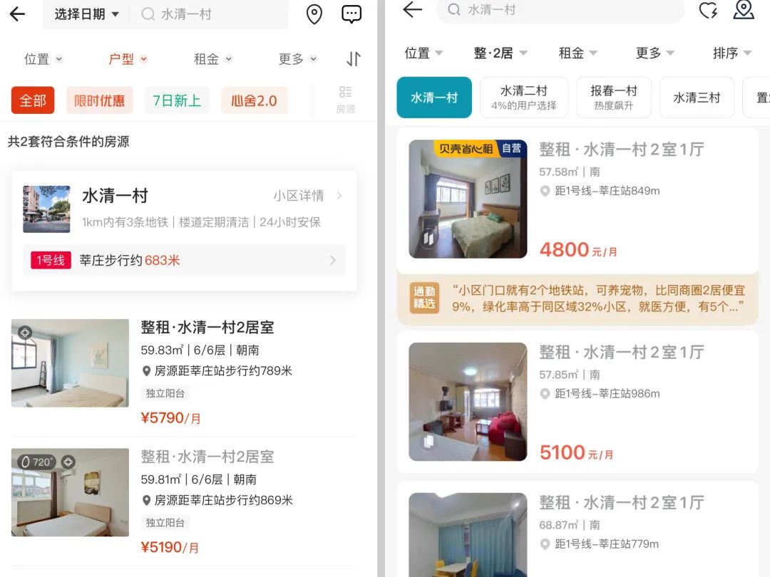 图/上海闵行莘庄地区“水清一村”整租二居价格对比 (左为自如,右为贝壳) 来源/燃次元截图