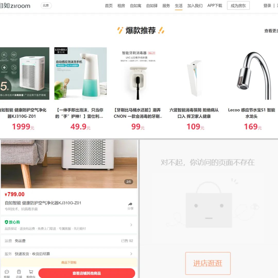 以生活服务(电商)为例,3月17日,燃次元打开自如-生活版块,其页面展示的5个商品,无一可购买,其中3个商品显示“商品下架”,2个商品显示“访问的页面不存在”。