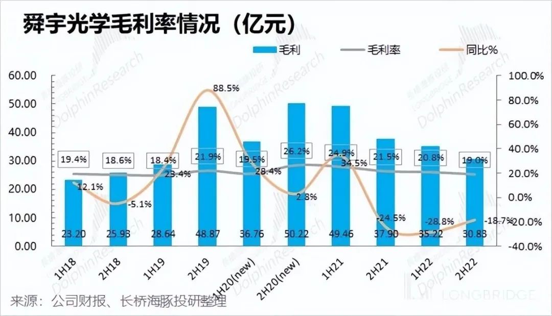 单看下半年,舜宇光学在 2022 年下半年实现毛利 30.83 亿元,同比下滑 18.7%,下滑幅度有所收窄。下半年的毛利率下滑至 19%,略低于市场预期的 19.7%,但海豚君认为公司的毛利率已经在靠向底部区间。