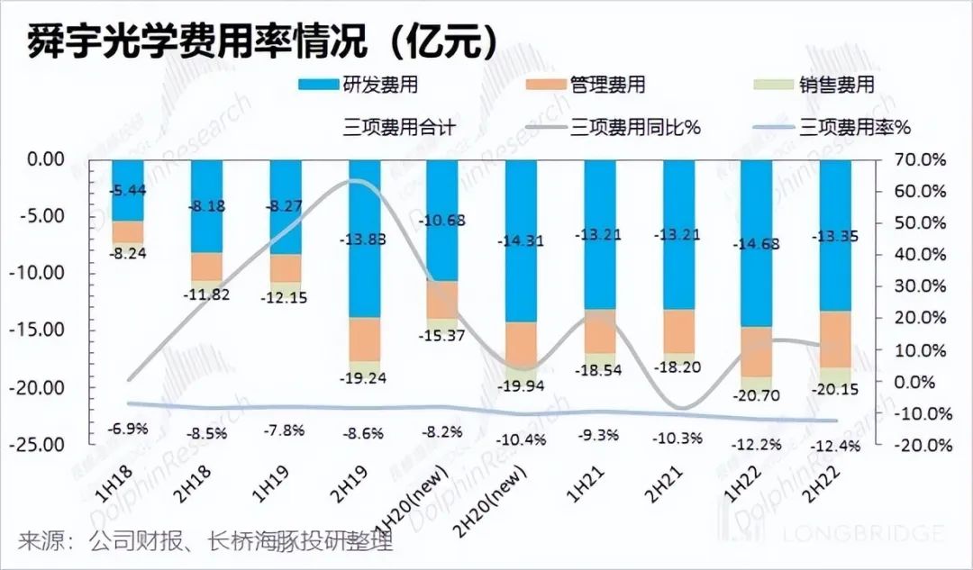 舜宇光学的核心费用情况主要有销售费用、管理费用和研发费用。舜宇光学 2022 年三项核心费用合计 40.85 亿元,同比增长 11.2%。三项核心费用率达到 12.3%。