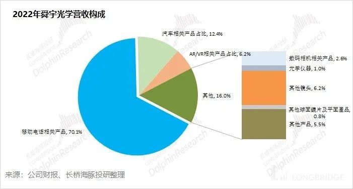 从舜宇光学 2022 年的营收来看,手机业务仍是公司最大的收入来源,但占比从过去的 8 成已经下降至 70%。汽车业务和 AR/VR 业务正在不断成长,公司也从这两年开始对该两项收入进行单独披露。
