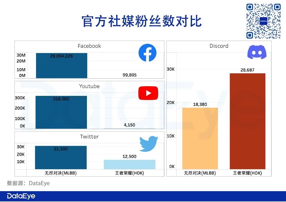 Facebook、youtube、Twitter上,《无尽对决》粉丝量都高于《王者荣耀》 (《无尽对决》上线了3年以上。《王者荣耀》相关账号多,且新注册了内容面向巴西的号) 。而Discord上,《王者荣耀》粉丝量高出《无尽对决》30%。