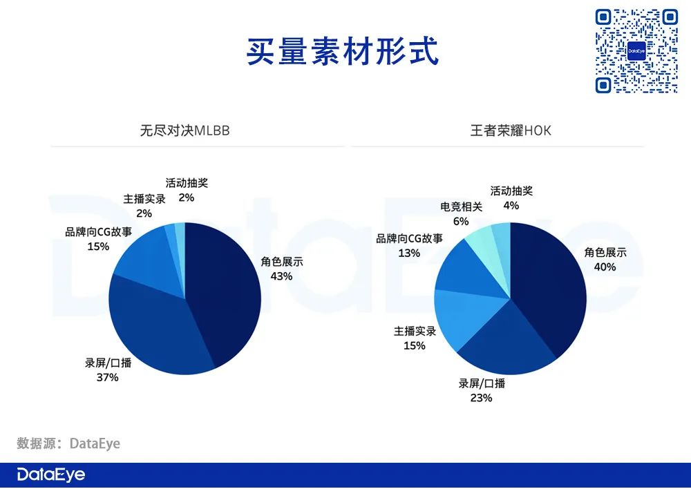 在买量形式上,两款游戏素材都体现了多样化的方式,素材形式占比也几近相同,王者的素材差异化的点则是有约6%的电竞相关素材。
