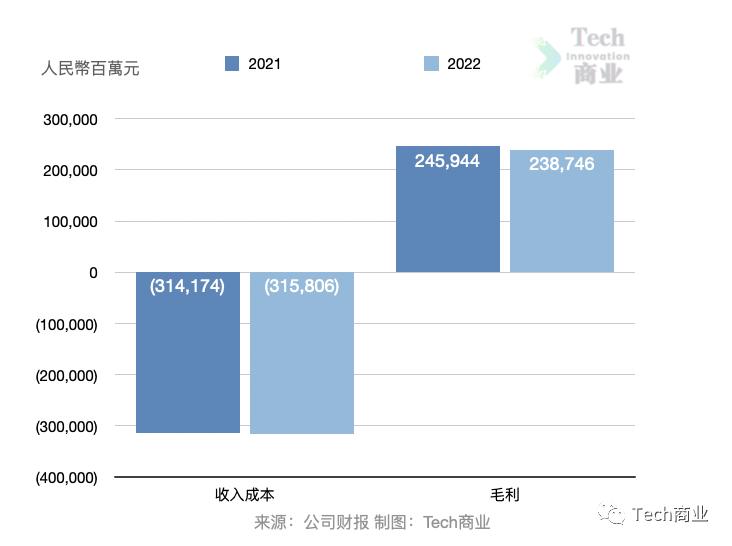 根据财报腾讯公司2022财年收入成本为3158亿元,同比上一财年同期的3142亿元,本财年收入成本增幅为0.5%。该公司本财年毛利为2387亿元,相较2021财年时期的2459亿元,本财年毛利减少2.9%。