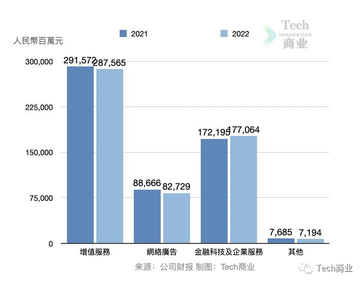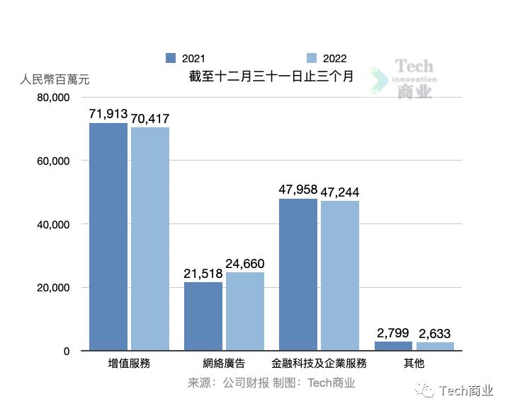 其中本财年增值服务贡献收入2876亿元,同比上一财年同期的2916亿元,本财年该项收入下降1.4%。网络广告业务本财年收入为827亿元,同比上一财年同期的887亿元,收入下降6.7%。金融科技及企业服务2022财年收入为1771亿元,同比增长2.8%。其他业务收入为72亿元,同比上一财年同期的77亿元,表现为收入下降6.4%。