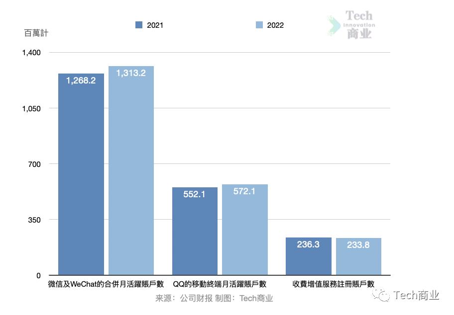 根据财报腾讯公司截至2022年12月,微信及Wechat的合并月活跃账户数为13.13亿,上一财年同期月活为12.68亿,本财年该项月活数表现为增长3.5%。QQ移动终端月活跃账户数本财年为5.72亿,上一财年月活为5.52亿元,本财年该项增幅为3.6%。