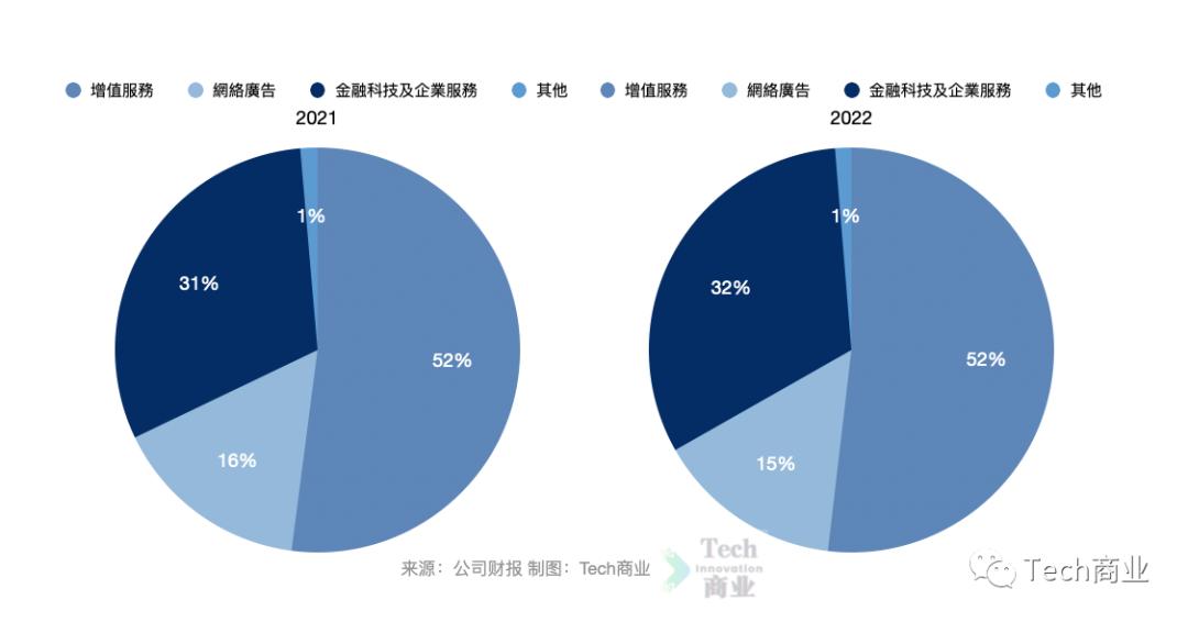 按收入占比来看,本财年增值服务、其他业务收入分别占比为52%、1%,分别与上一财年同期占比持平。网络广告、金融科技及企业服务本财年收入占比分别为15%、32%,与上一财年的16%、31%相较,分别表现为收入占比下降、增长。