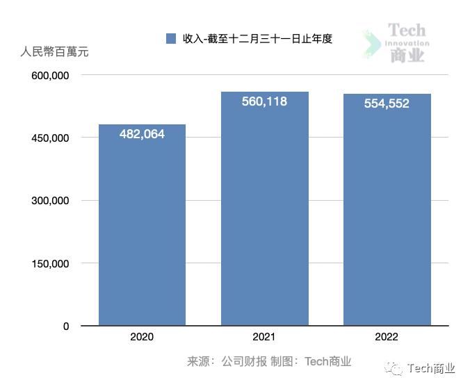 根据财报,腾讯公司2022财年收入为5546亿元,同比2021财年时期的5601亿元,收入下降1%。该公司2021财年收入同比2020财年表现为增长16.2%。即最新财年腾讯收入从增长转为下降。