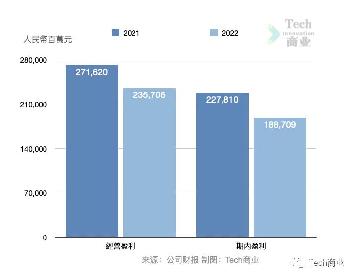 根据财报腾讯公司本财年经营盈利(按国际财务报告准则)2357亿元,上一财年为盈利2716亿元,本财年经营盈利减少13.2%。2022财年该公司年度盈利为1887亿元,相较上一财年同期的2278亿元,本财年年度盈利减少17.2%。