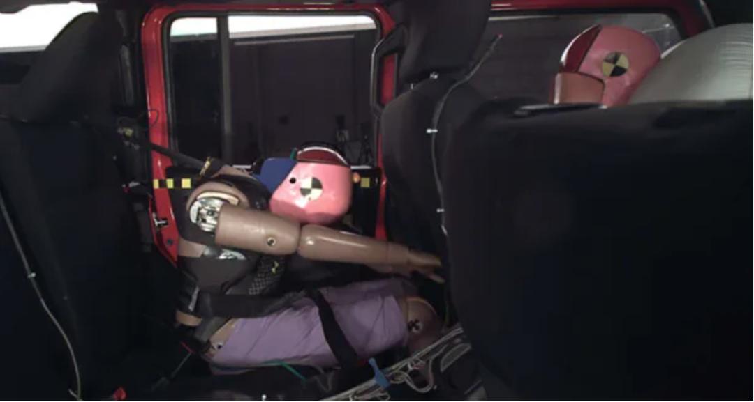 后排安全性测试采用中等40%重叠正面碰撞测试(moderate overlap frontal test):测试车辆以40英里/小时(约64公里/小时)的速度双向碰撞,除了驾驶员座位上的假人,还增加了车辆第二排模拟女性乘客或12岁青少年的假人。要想获得良好评级,碰撞不能对第二排假人的头部、颈部、胸部、腹部或大腿造成过度伤害,而且保护后座乘员不能以牺牲驾驶员的安全为代价。