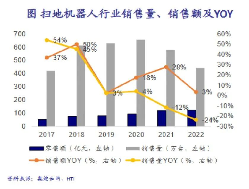 据奥维云网数据,2022年扫地机器人线上销量同比下滑22.58%,线下销量同比下滑26.78%。科沃斯市场2022年线上市场份额占比近40%,石头科技占21.3%,云鲸占15.05%。