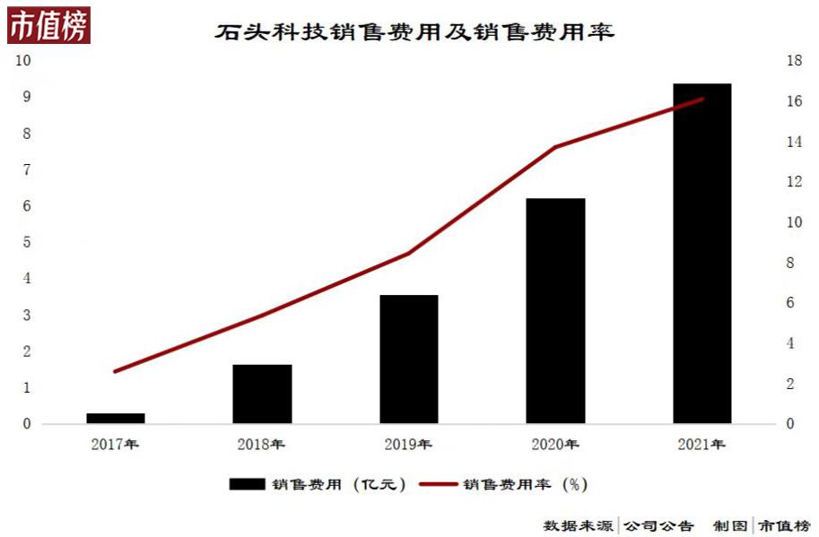“去小米化”的另一面是销售费用的激增。石头的销售费用由2017年的2881万元上涨到2021年的9.38亿元,2022年前三季度销售费用为7.88亿元,销售费用率由2017年的2.57%上涨至17.95%。
