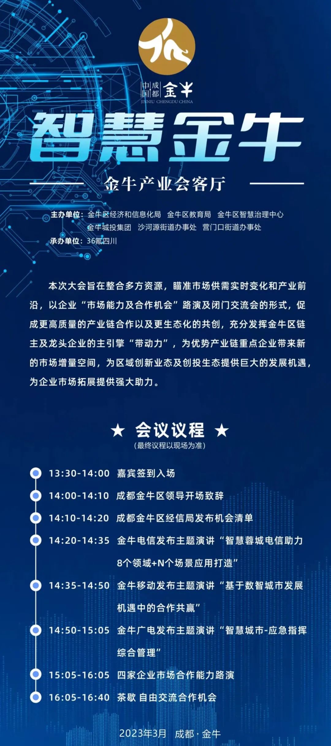 为优化金牛区营商环境,为区域创新业态及创投生态提供巨大的发展机遇,3月30日,由成都市金牛区经济和信息化局联动36氪四川打造的“智慧金牛”金牛产业会客厅活动,将在金牛区兴盛国际大厦一楼BEEPLUS举行。