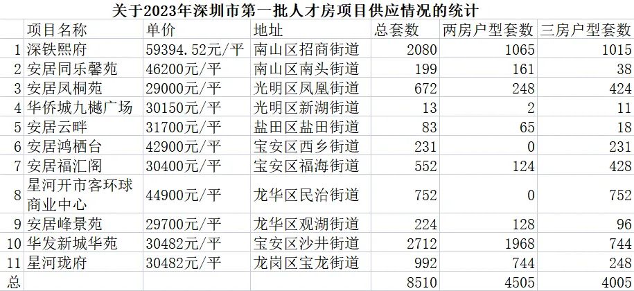 这两天,2023年深圳市第一批市场价6折的人才房选房工作正在进行,共推出11个人才房项目,共8510套房源。目前,位于南山的深铁熙府、安居同乐馨苑和位于宝安沙井的华发新城华苑公布了选房结果。