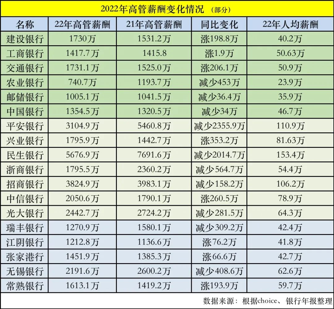 此外,目前已经披露的银行数据来看,多数股份制银行也均在积极的压降高管薪酬,浙商银行、招商银行、光大银行也出现在高管薪酬锐减的队列。兴业银行及中信银行则逆势上涨,在2022年度,该两家银行高管薪酬分别较去年同期上涨353.2万、及260.5万。