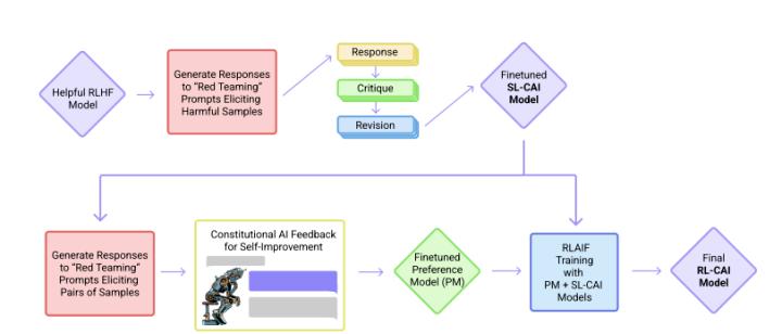 CAI用人工智能反馈来代替人类对表达无害性的偏好,即RLAIF,人工智能根据一套法规(Constitution)原则来评价回复内容。