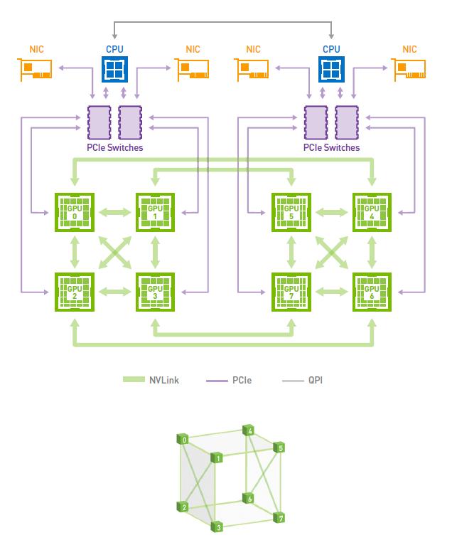 以英伟达为例,HGX平台上有六个NVSwitch。每个NVSwitch连接2块GPU,总共有12个最短数据通道直连,形成接近立方体式的数据交互网。这里之所以说接近,是因为0123和4567平面之间的连接还不是两两互连,这一结构会限制GPU所能运行的模型的规模效率。