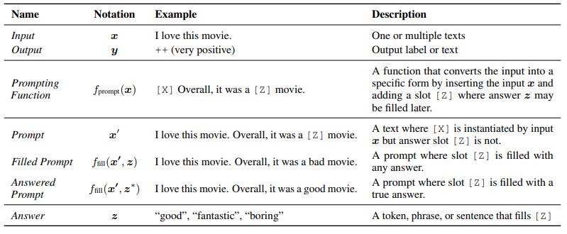 这里举一个填充提示的简单例子。(上图)我们从输入x(比如电影评论)开始,然后输出期望值y。其中一个任务是使用提示函数重新模板化此输入,其输出表示为x'。此时语言模型的任务仅仅是预测z值(句子中的一个词)来代替占位符Z。然后对于Z被答案填充的提示,我们将其称为填充提示。通过这一提示方式,在对应细分场景下,语言模型将原来的问题的期望值y(一句话)简化为答案z(一个词)的计算,明显降低了应答的复杂度。