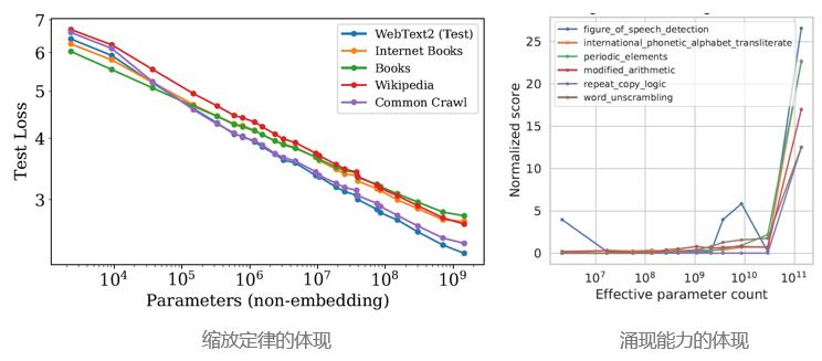 ▲缩放定律(参数增加后精度损失连续减少)V.S. 涌现能力(1010-1011参数后新能力的涌现)(来源:OpenAI)