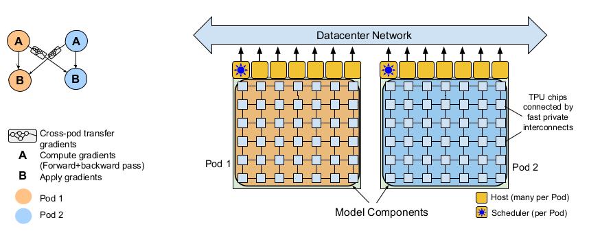 ▲Google Pathways “CPU+DSA”训练集群基础架构(来源:Google)