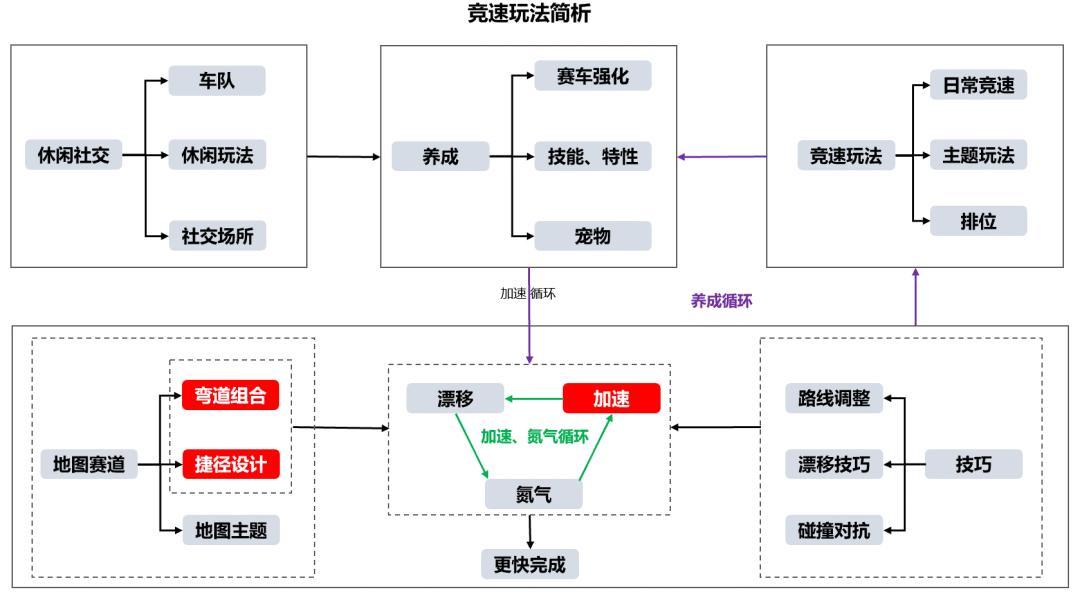 最后一个绕不开的内容是“养成”。一般来说养成维度和深度“因游而异”,其系统的侧重点也会略有不同。但具体到传统竞速游戏上,无非就是围绕“加速度”、“集气速率”、“氮气时长”、“氮气加速度”等赛车属性展开。