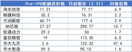 以发行价计,这些Pre-IPO投资的回报都相当不错。回报倍数最高的登康口腔,Pre-IPO轮有4倍回报,最低的柏诚股份也有近3倍回报。