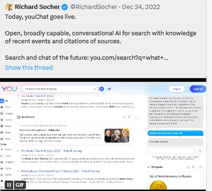 有的引擎跑在对手前面。You.com搜索引擎2021年11月才推出,去年12月就已经推出第一代聊天机器人YouChat。