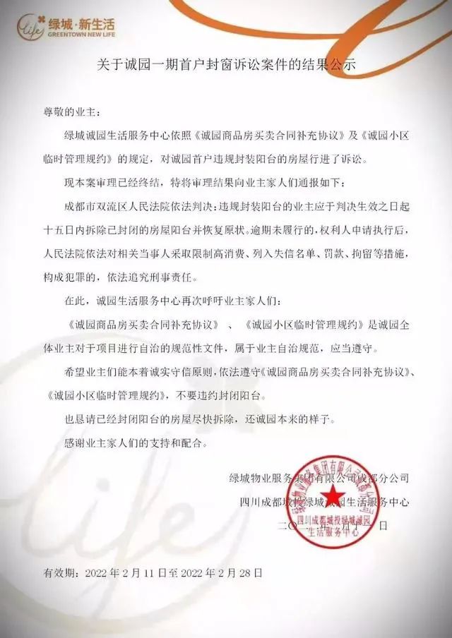 2021年11月,绿城·诚园物业将小区首位自行封阳台的业主高先生,以其有违诚实信用原则告上法庭,要求他立即拆除已封闭的阳台并恢复原状。