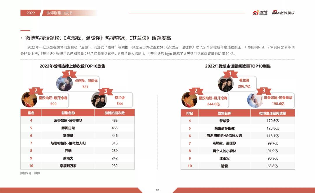 据《2022微博娱乐白皮书》,2022微博热搜上榜次数最多的剧集,来自优酷的《点燃我,温暖你》,《星汉灿烂·月升沧海》排名第二;而2022微博主话题阅读量最多的是《苍兰诀》,《星汉灿烂·月升沧海》依然是第二。