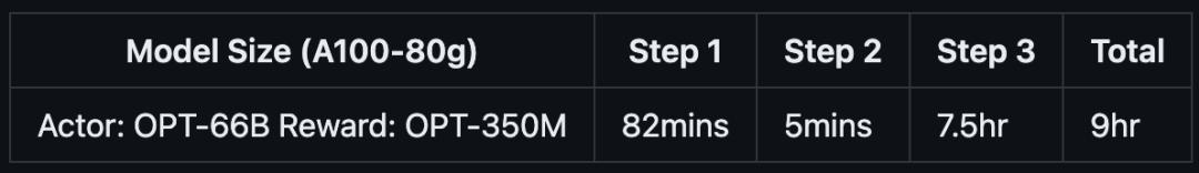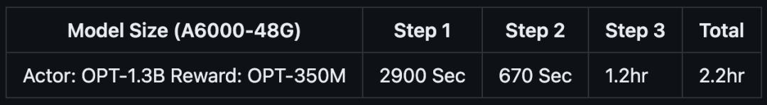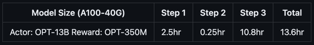 如果你只有半天的时间,以及一台服务器节点,则可以通过预训练的OPT-13B作为actor模型,OPT-350M作为reward模型,来生成一个130亿参数的类ChatGPT模型: