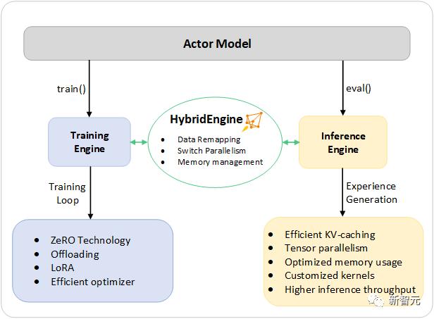 混合引擎可以在训练和推理中无缝地改变模型分区,以支持基于张量并行的推理,和基于ZeRO的训练分片机制。