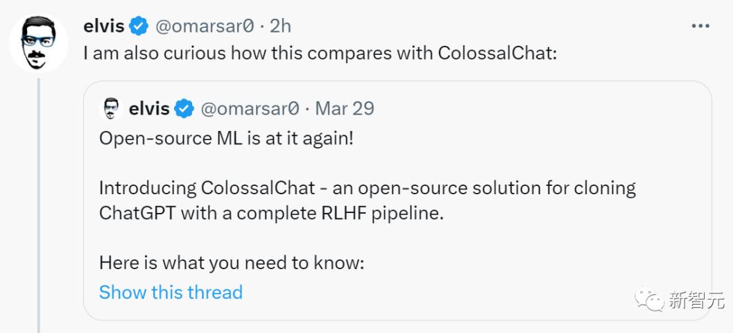 前Meta AI专家Elvis激动转发,称这是一件大事,并表示好奇DeepSpeed Chat和ColossalChat相比起来如何。