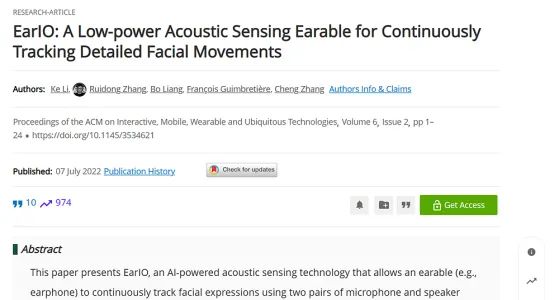 这篇名为《EchoSpeech:由声学传感驱动的眼镜上的连续无声语音识别(EchoSpeech:Continuous Silent Speech Recognition on Minimally-obtrusive Eyewear Powered by Acoustic Sensing)》的论文本月将在德国汉堡举行的CHI(Conference on Human Factors in Computing Systems)计算机协会会议上发表。