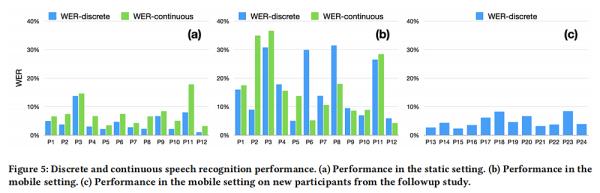 在离散研究中,每个无声指令最长的持续3秒,3秒之后就自动跳到下一个指令;在连续研究中,被试者有4秒的时间来把每句话传递给声呐眼镜,完成后按空格键或是右箭头跳到下一个指令,被试者们尽可能以自然的速度和语气“说话”。