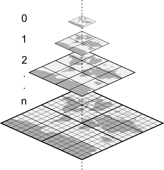 为了解决该问题,地图派团队开始了新一轮的研发周期。江复兴想到矢量切片技术。就是将矢量数据以建立金字塔的方式切割,分成一个一个瓦片。矢量切片的优点是数据大小通常比栅格瓦片小,客户可以轻松获取并绘制高分辨率地图。
