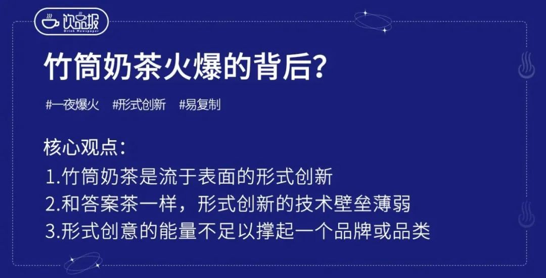 和答案茶一样,竹筒奶茶亦是形式创新大于产品创新。来自答案茶和竹筒奶茶(们)的前车之鉴,形式创新可以成为某一个新品的一个创意,却不足以成就一个品牌或者带火一个品类。一是因为这种创新缺乏真正的技术壁垒,很容易被模仿,越火越乱;二是流量重于产品的运营模式,本身就意味着“短视”。