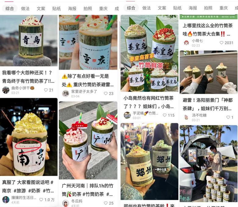 小红书搜索竹筒奶茶,显示已有2万+篇笔记。点击进去,里面是各种各样、流行于各地的打卡笔记,一时间,竹筒奶茶,成为“到此一游”的另一种表达方式。